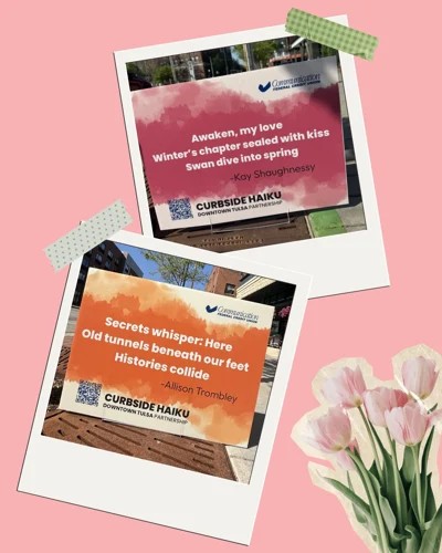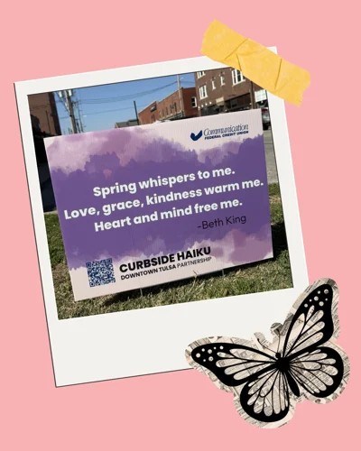 “Each spring, Curbside Haiku transforms Downtown Tulsa’s streetscape with poetry and art, bringing creativity to unexpected p;ace,” said Downtown Tulsa Partnership. “This temporary public at project, presented by Downtown Tulsa Partnership, activates tree wells and planter beds with haikus and visual artwork from local Tulsans.”